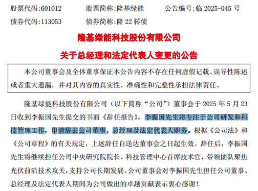 5月26日晚,隆基绿能发布公告称,李振国辞去公司董事、总经理及法定代表人职务,将继续担任公司中央研究院院长、科技管理中心首席技术官,专注带领团队聚焦光伏前沿技术攻关。记者从隆基绿能相关负责人处获悉,此次变动不会影响公司日常经营,控股股东及实控人未发生变化,战略方向保持连贯。