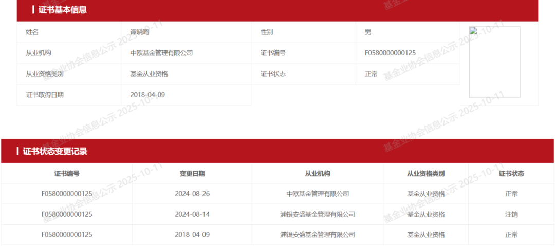 2024年8月26日,谭晓鸣的从业机构变更为中欧基金。
