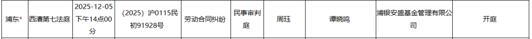 时隔2年后,这次公募基金公司被曝出因劳动合同纠纷被员工起诉的涉事方为浦银安盛基金管理有限公司,原告为谭晓鸣,案件将于2025年12月5日下午开庭。