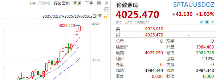 截至发稿,伦敦金现报4025.47美元/盎司,涨逾1%,年内涨幅超53%。
