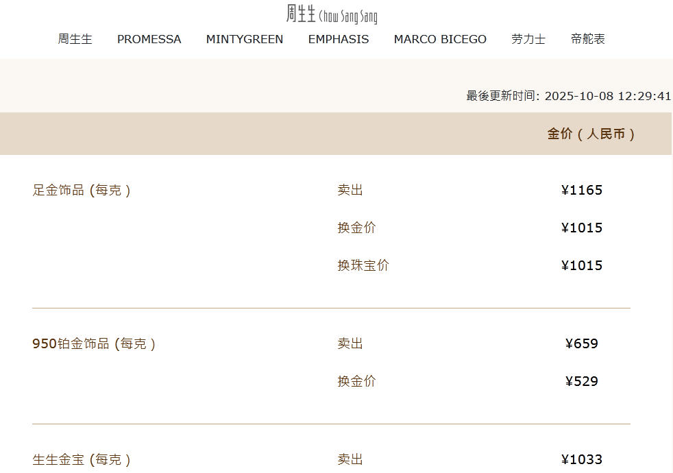 中新经纬注意到,截至目前,周大福足金(饰品、工艺品类)价格为1162元/克,较10月1日(1129/克)上涨33元。周生生足金饰品价格为1165元/克,较10月1日(1130/克)上涨35元。老凤祥足金饰品价格为1160元/克,较10月1日(1125元/克)上涨35元。