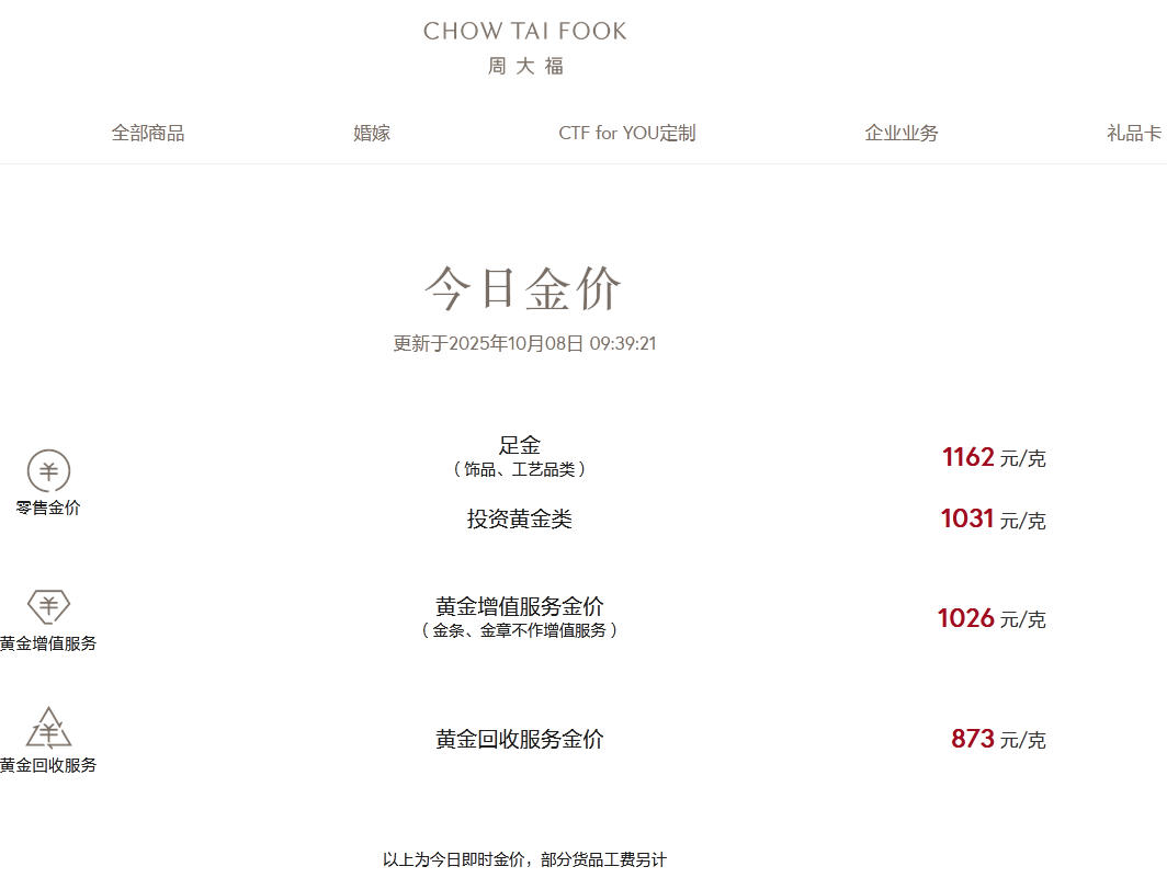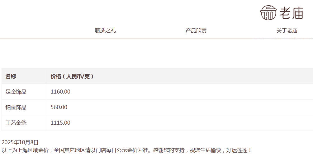 此外,潮宏基足金(首饰摆件)价格为1162元/克;老庙足金饰品价格为1160元/克。